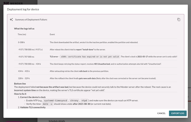 Knowing the challenges users face with log analysis, the Mender team developed a new AI feature to make the failure analysis easier.