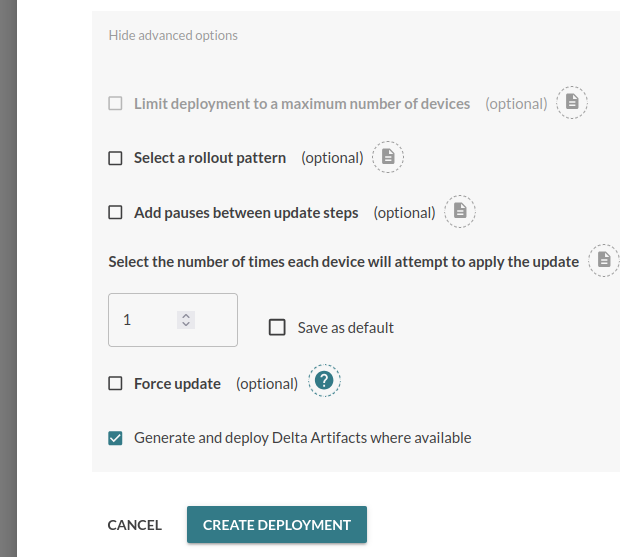 With server-side generation of delta updates in Mender, this device-specific delta generation is automatically and transparently solved by the Mender Server. For a given deployment, delta updates can be enabled under Advanced options.