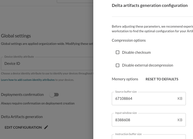 As an optional step, optimizing the delta generation to the smallest possible size depends on the Artifact being deployed and the changes made between the releases. These parameters can now be set in Global settings in the Mender UI.